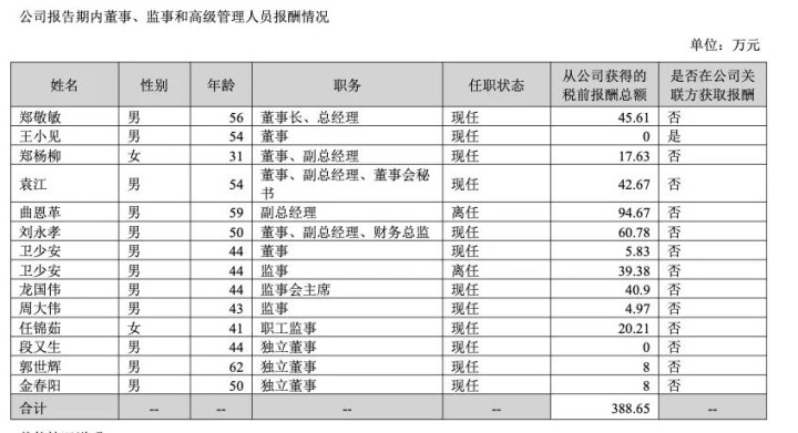 2024年年报显示,公司董事、监事和高级管理人员2024年报酬总额388.65万元。董事长、总经理郑敬敏2024年从公司获得的税前报酬总额为45.61万元。董事、副总经理、董事会秘书袁江2024年从公司获得的税前报酬总额为42.67万元,董事、副总经理、财务总监刘永孝2024年从公司获得的税前报酬总额为60.78万元,以上人员均未在公司关联方获取报酬。